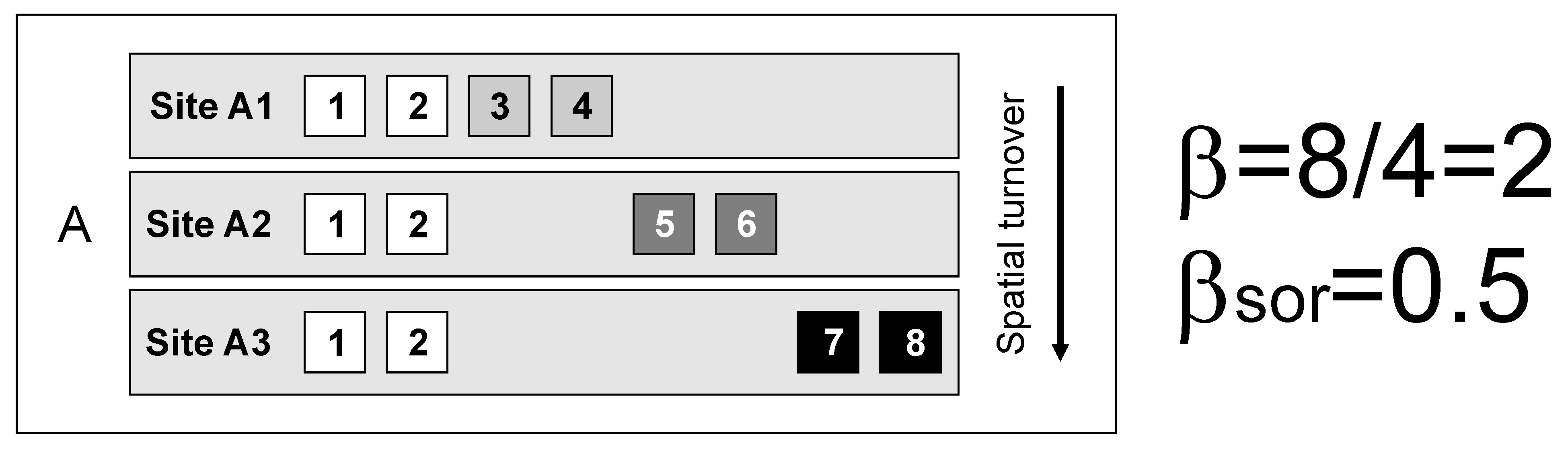 The term beta diversity was introduced by R.H. Whittaker in 1960. He defined it as “the extent of change in community composition, or degree of community differentiation, in relation to a complex-gradient of environment, or a pattern of environments”. In his original paper, Whittaker proposed several ways to quantify beta diversity. In its simplest form (which we will call strict sense or multiplicative beta diversity), beta diversity is defined as the ratio between gamma (regional) and alpha (local) diversities (Whittaker, 1960; Jost, 2007). Therefore, it is the effective number of distinct compositional units in the region (Tuomisto, 2010). Essentially, beta diversity quantifies the number of different communities in the region. So it’s clear that beta diversity does not only account for the relationship between local and regional diversity, but also informs about the degree of differentiation among biological communities. This is because alpha and gamma diversities are different if (and only if) the biological communities within the region are different.