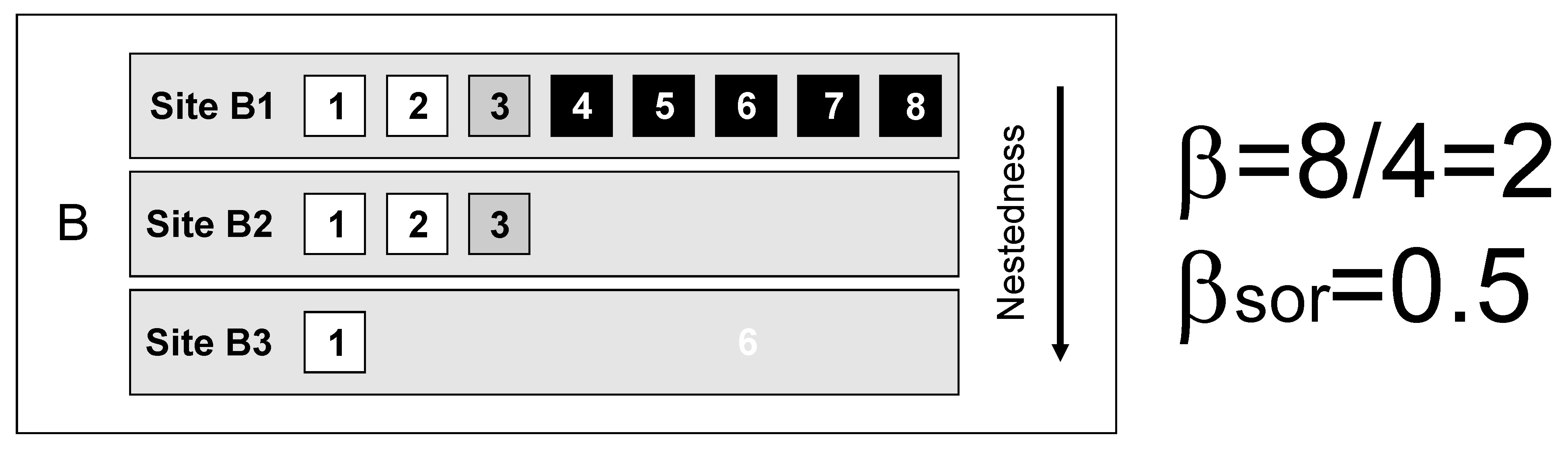 However, the nested loss of species from the richest to the poorest locality can also cause alpha and gamma diversity to differ. This has the potential to yield the same value of beta diversity for strikingly different patterns.