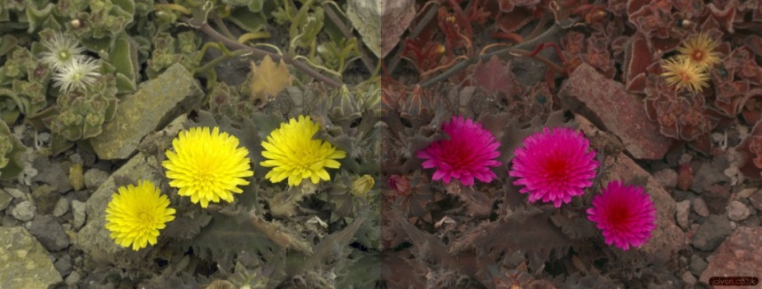 Using a camera converted to full spectrum sensitivity, one photograph taken through a visible-pass filter can be combined by the software with a second taken through an ultraviolet-pass filter. The software can then generate functions to show the image through an animal’s eyes.