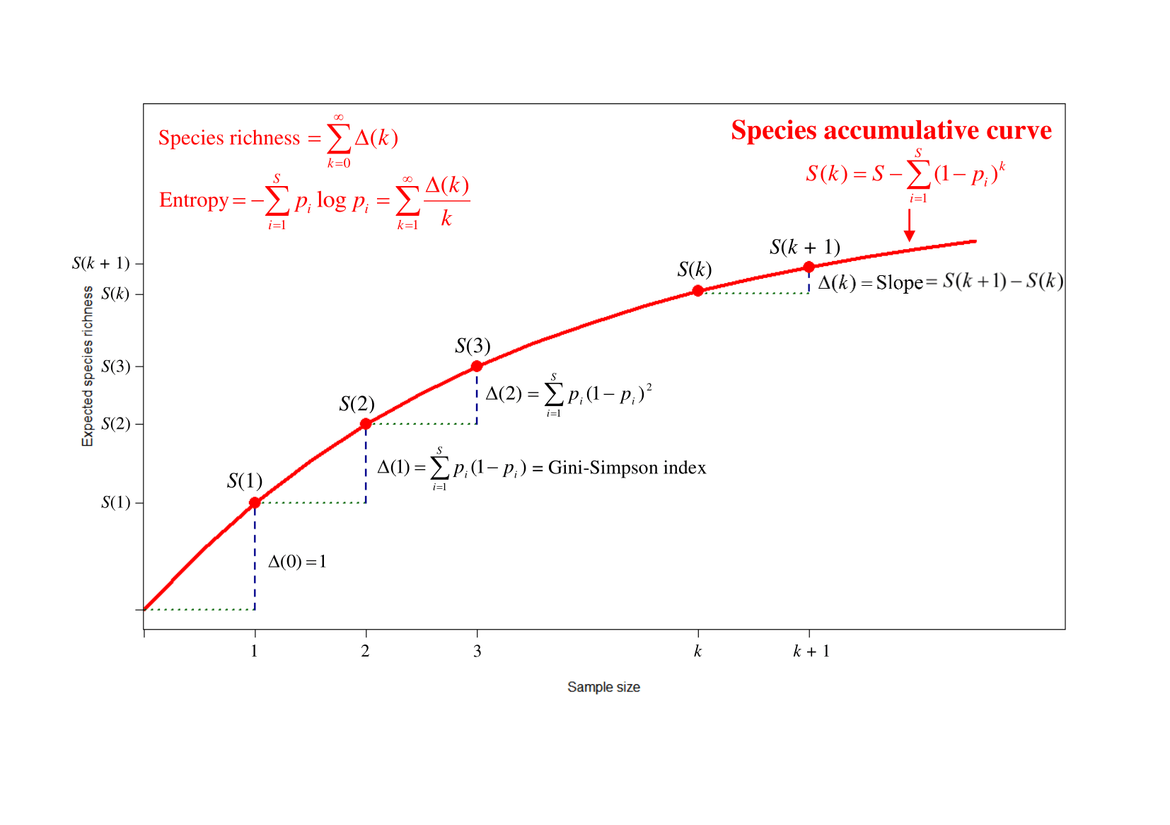 The figure above also reveals that species richness can be expressed as the sum of all slopes, and the Gini-Simpson index is simply the slope at initial size 1. Moreover, diversities (Hill numbers) and entropies (Rényi entropies and Tsallis entropies) of any order q (the parameter which determines the measures’ emphasis on rare or common species) can all be expressed as functions of successive slopes of a species accumulation curve. Rather than selecting one or a few measures to describe the diversity of a community, we can convey the complete story by presenting a continuous profile: a plot of diversity or entropy as a function of q ≥ 0.