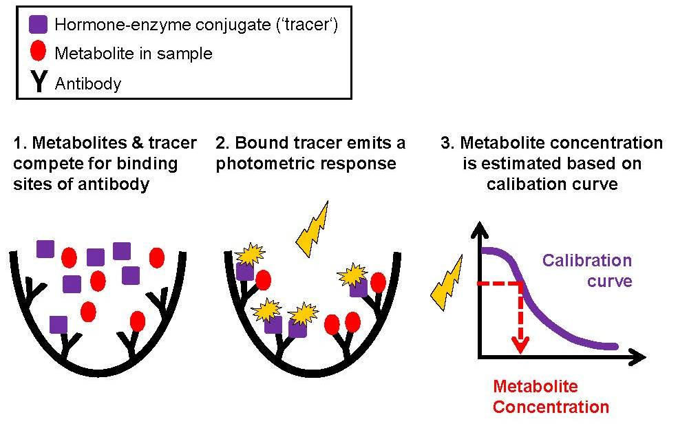 Enzyme immunoassays constitute a widespread method to quantify the concentration of hormone metabolites contained in excrement. The principle of an enzyme immunoassay is straightforward: the hormone metabolites contained in a sample compete with a known amount of tracer – the mother-hormone conjugated with an enzyme – for the binding sites of an antibody specific to the hormone of interest. The tracer generates a visible response that is proportional to the amount of tracer bound to the antibody. The metabolite concentration in a sample is then estimated by relating the measured response to a calibrated dose–response curve generated by standards of known hormone concentration.