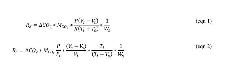 Measurements of CO2 concentration are a means to the end – not an end in themselves. As researchers, we still need to get the maths right. Assuming that the measurement of CO2 is correct; we still need to convert our measurement data into CO2 efflux rates. This involves derivation from the ideal gas law (PV=nRT, details in Dossa et al. 2015) to respiration rate of substrate (Rs) given the knowledge of the volume of the chamber (Vc), the volume of the substrate (Vs) (i.e. the wood or leaves under measurement), and the ambient temperature (Tc) and pressure (P). Avoiding basic mistakes requires the understanding, correct use and inclusion of variables in the following equations (eqn 1 or 2).
