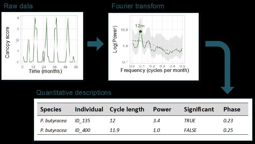 The major challenges to the development of this approach were the lack of data, and ability to confidently differentiate real cycles from noise. Compared to other data that Fourier are regularly applied to (e.g. audio signals or GIS images), observed canopy data are collected at relatively long intervals (often monthly) given the relatively short 6, 12 or 18 months phenological cycles that we expect. To detect cycles with confidence a lot of effort and investment is required to maintain long-term studies, and few sites exist with more than ten years’ data. The longest continuous tropical phenology studies in the world – Lopé National Park, Gabon and Barro Collorado Island, Panama – began in 1984 and 1987 respectively.