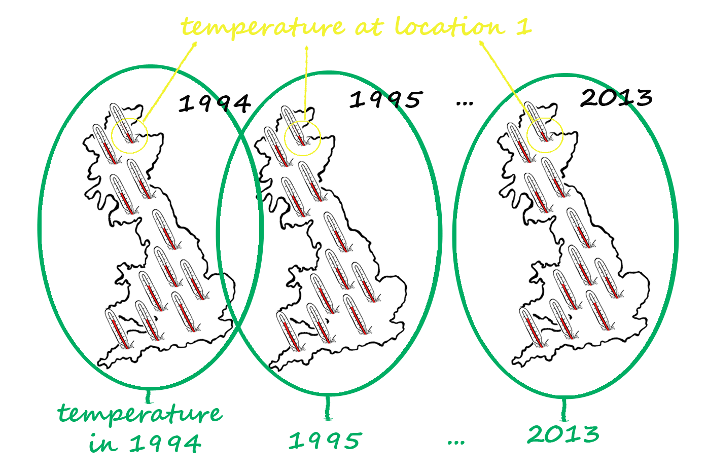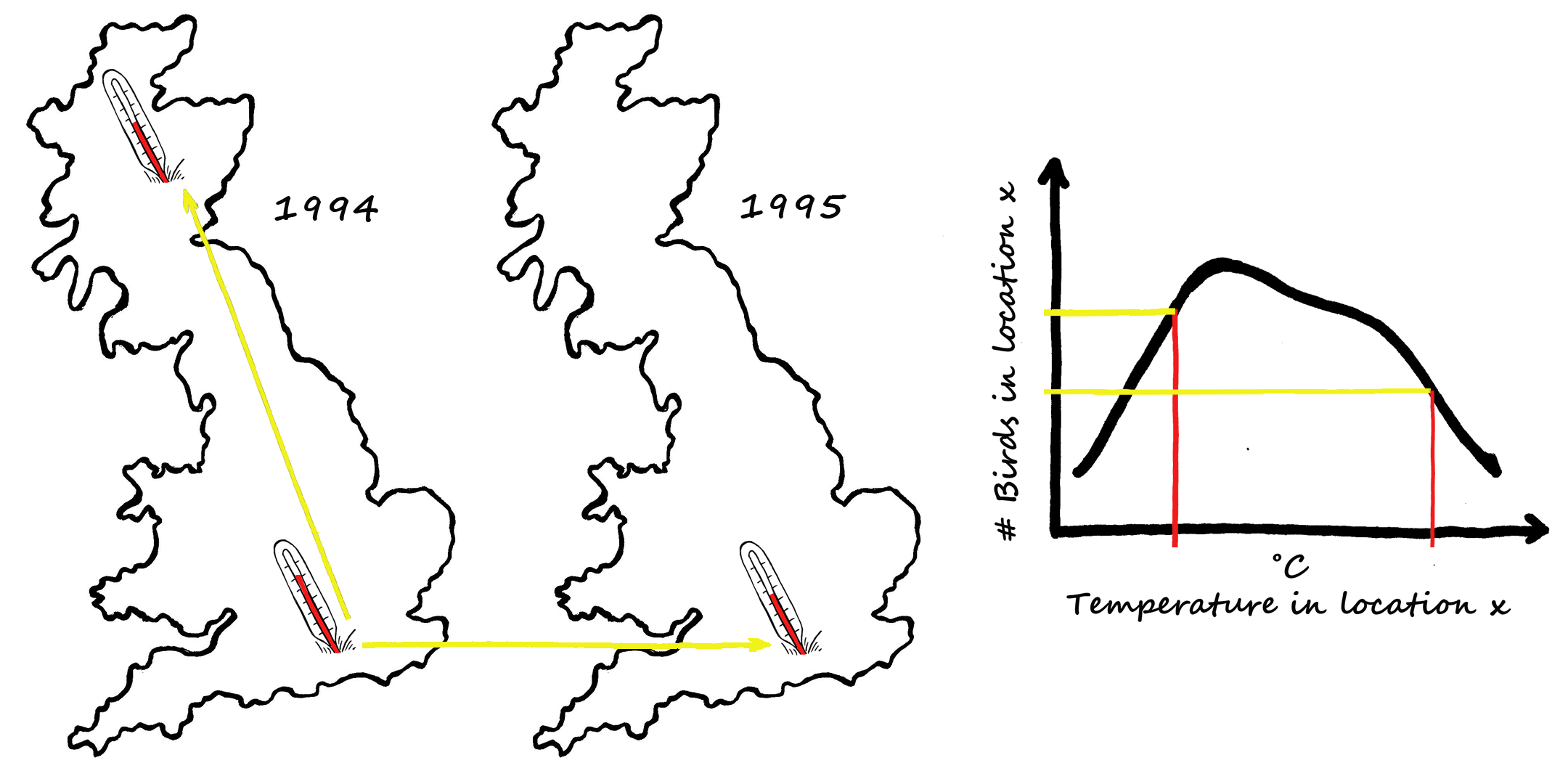 When trying to understand how wildlife, for example a bird species, may react to climate change scientists generally study how species numbers vary in relation to climatic or weather variables (e.g. Renwick et al. 2012, Johnston et al. 2013). The way this tends to be done is by gathering information (data!) about bird numbers as well as the weather variables (for example temperature) in several locations (i.e. in space) and fitting a regression model to these data to detect and illustrate how bird numbers go up or down with temperature.
