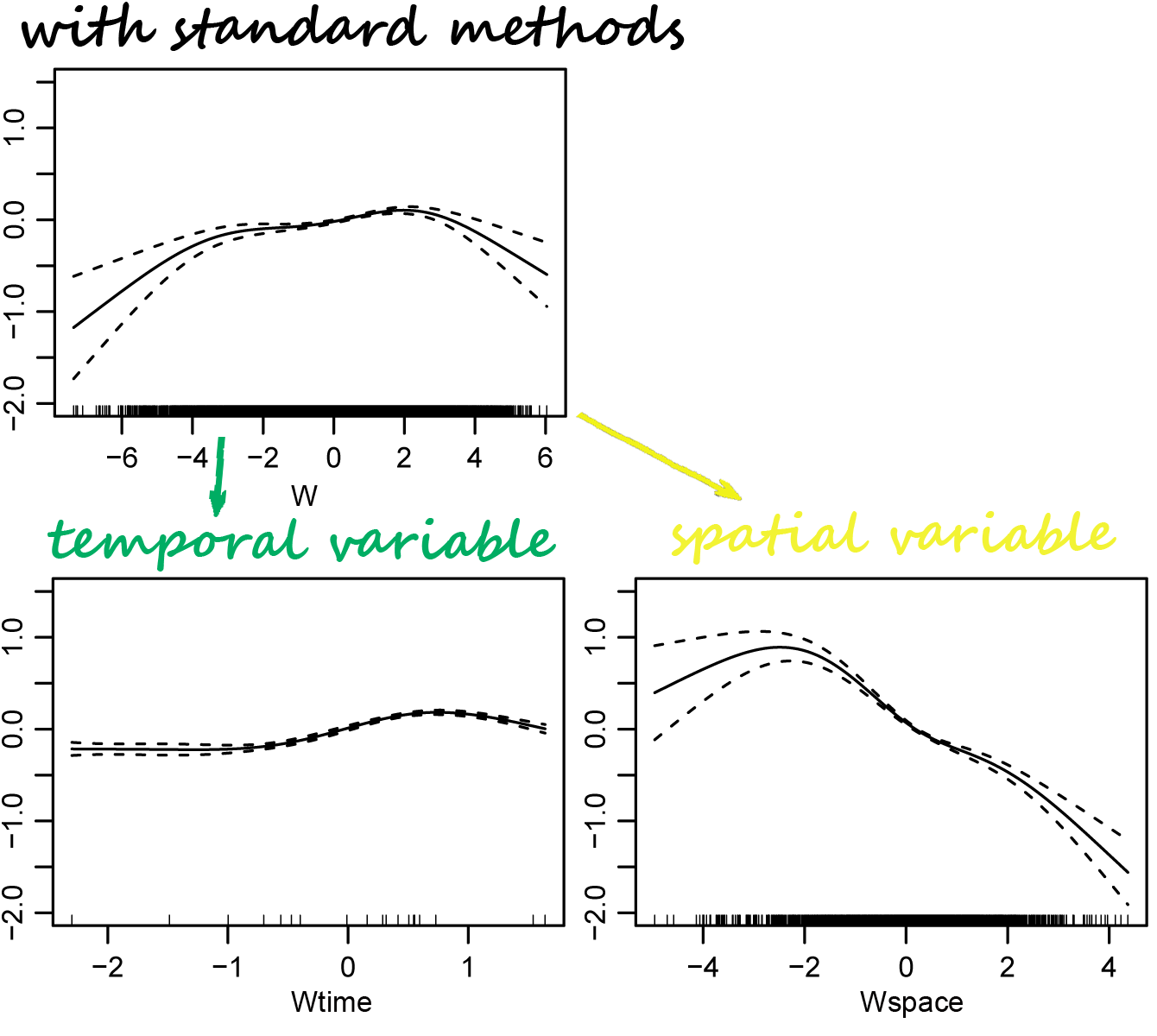 There is potentially a confounding issue in the standard method though. Using this method means that, for example, we would have to believe that a change in temperature in one location from 12°C to 13°C (temporal variation) would have the same effect as the difference between two locations at one point in time (spatial variation), one location at 12°C and one at 13°C. In technical terms: the standard method confounds the spatial and temporal effects of the weather variable on bird numbers.
