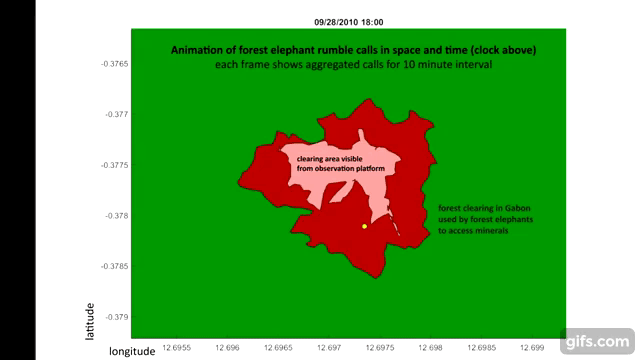 The ability to collect data continuously over large spatial scales, even in very remote locations, without observer presence or bias, offers unprecedented temporal detail on the occurrence of repeated events. For example, Astaras et al. 2017 monitored illegal gun-hunting in Korup National Park, Cameroon, over several years. It was known that poaching inside the national park was common (mostly for primates and small ungulates), but it was frightening that they recorded an average of one gunshot every two days in each 4.5 km2 portion of the park year after year. These acoustic data provided details on the seasonal, diel, and spatial pattern of poaching that were unsuspected based on physical evidence obtained by anti-poaching patrols. For example, could the animation below shows how hunting activity changed through the week relative to bush meat market day in the nearby villages.