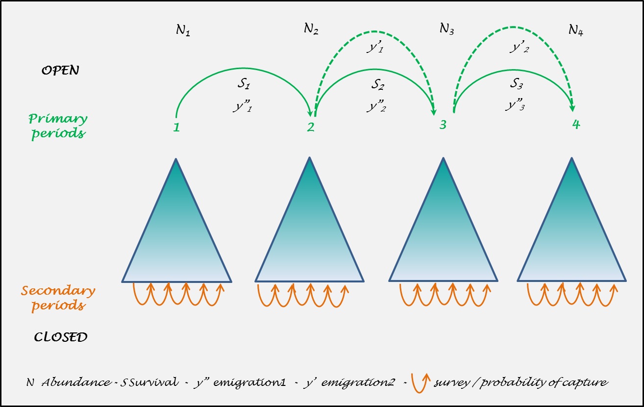 - Primary periods are longer periods of time (e.g. seasons, years). The time between primary periods is long enough that the population can be described as open. This means that additions to the population through births and immigration, and losses from deaths and emigration can occur (for examples see: Nicholson et al. 2012 and Smith et al. 2013).