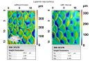 With gel-based profilometry, you can tune the gel properties to match even very soft surfaces, such as the epidermis and mucus that covers the scales of live fish. Above, we show a bluegill (Lepomis macrochirus) that was imaged with and without mucus. Without mucus, many surface details of scales are obvious, such as the concentric growth lines of each scale, the lateral line, and clear margins made of spiny ctenii. When mucus is present, the surface details are obscured. Below each image we provide tables of common surface parameters including root-mean-square roughness (Sq – http://bit.ly/2Amhpeb), kurtosis (Sku – http://bit.ly/2zUY8ne), and skew (Ssk – http://bit.ly/2zUY8ne). Roughness is much lower on the surface with mucus, demonstrating its smoothing effect. This smoothing effect and the material properties of mucus will likely affect the swimming performance of this fish, and these results show how useful this technique can be for exploring surfaces of live animals. Images: Dylan Wainwright and the Freshwater and Marine Image Bank.