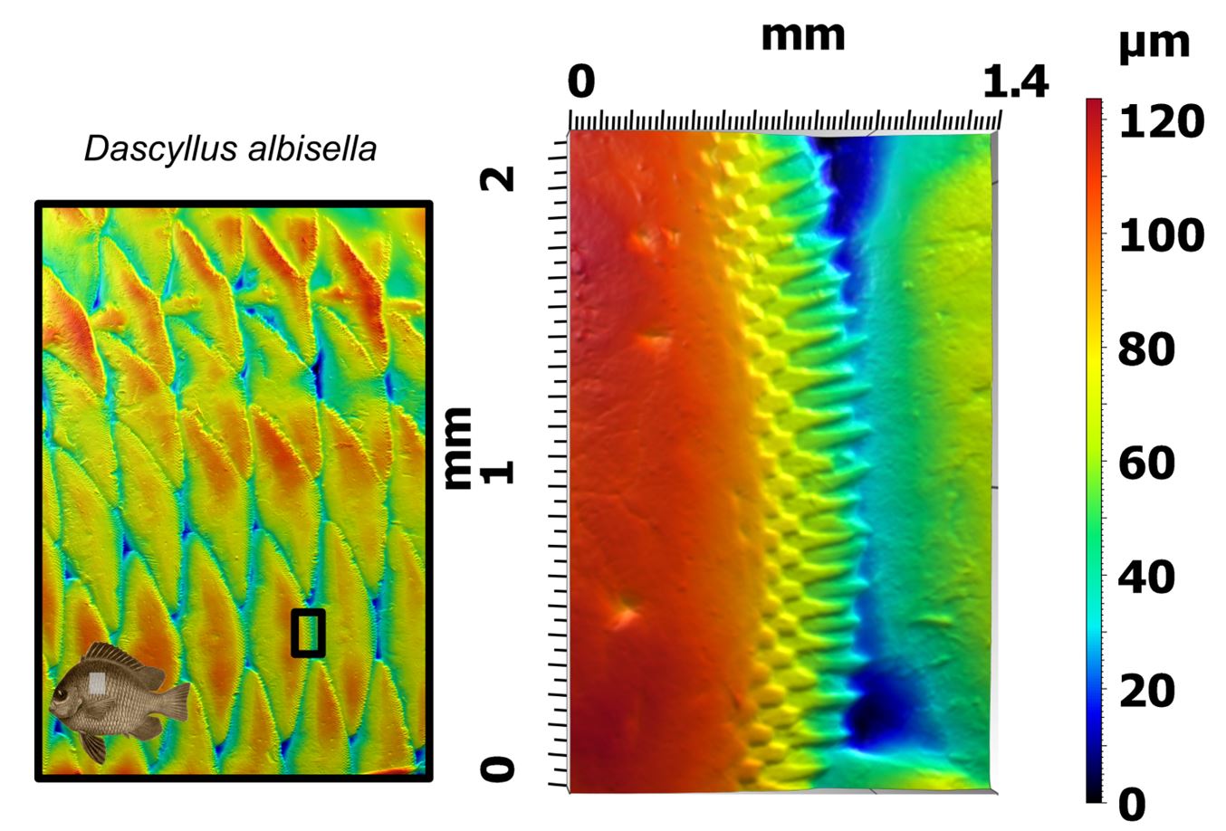 Each reconstructed surface is made up of over 18 million three-dimensional points (x, y, and z). This allows for a substantial amount of digital zoom with the ability to still recover surface features. Above is an enlarged view of the posterior margin of a scale from Dascyllus albisella from the same image as the previous two slides. The posterior margin of this scale is made of ctenii, which are small interlocking spines that are present on the scales of many species of fish. Those at the margin are the longest and newest, with older ctenii becoming shortened and serving as a scaffold to interlock with newer ones. Images: Dylan Wainwright and the Freshwater and Marine Image Bank.