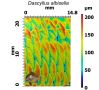 In this picture you can see the surface topography of Dascyllus albisella, reconstructed from the six greyscale images in the previous image. This image captures the lateral line, visible at the top of the image as a row of scales connected by a canal. Heights on this surface are shown as colours: the warmer the colours (oranges and reds), the higher the heights. The height range of this surface is just over 200 microns – the highest parts of the surface are over 200 microns higher than the lowest . Images: Dylan Wainwright and the Freshwater and Marine Image Bank.