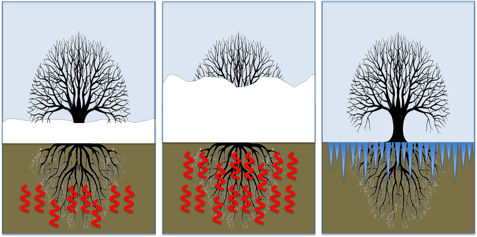 In some regions, like many areas of tundra, where climate warming is expected to lead to greater winter precipitation as snow in the future, a deeper snowpack may better insulate soils and lead to warmer soils throughout the winter (Sturm et al. 2005). In other areas, like many mid-high latitude forests and grasslands, reduced snowfall and accumulation are projected to occur. This change will result in soils being exposed to cold and inconsistent winter air temperatures and is expected to lead to colder soils, often with increased frequency of freeze-thaw events (Henry 2008; Brown & DeGaetano 2011). Also important are shifts in the timing of snowmelt in spring and/or the onset of snowpack in early winter, which have implications for growing season length and patterns of soil temperature in the shoulder seasons (spring and autumn).
