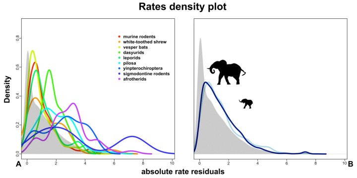 The reason I bring up this result is that it gives another twist to the significance of RRphylo in relation to other phylogenetic comparative methods. When you’re working with the phenotypes, you have to consider all the weird and unusual things that come with the fossil record. By using the BM, or most phylogenetic comparative methods (PCMs) , the evolutionary model is applied almost treewise, and it’s difficult to get idiosyncratic results from extremely ‘deviant’ phenotypes . With RRphylo, even isolated tips, presumed to evolve under a certain regime, could be tested to find out if they have different evolutionary rates. The classic example, presented in the paper, is the idea that body size evolution accelerates in insular vertebrates (by the way, it doesn’t! See the ‘mammal’ figure below, right side).