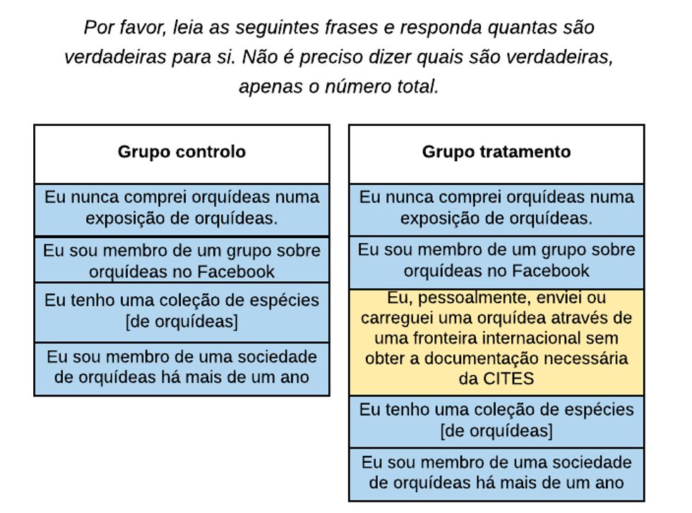 Uma amostra aleatória de 50% dos entrevistados recebe uma lista que inclui apenas itens não sensíveis (sombreado azul no exemplo sobre o comércio ilegal internacional de orquídeas), enquanto a outra metade vê uma lista que inclui também um item sensível (amarelo sombreado neste exemplo).