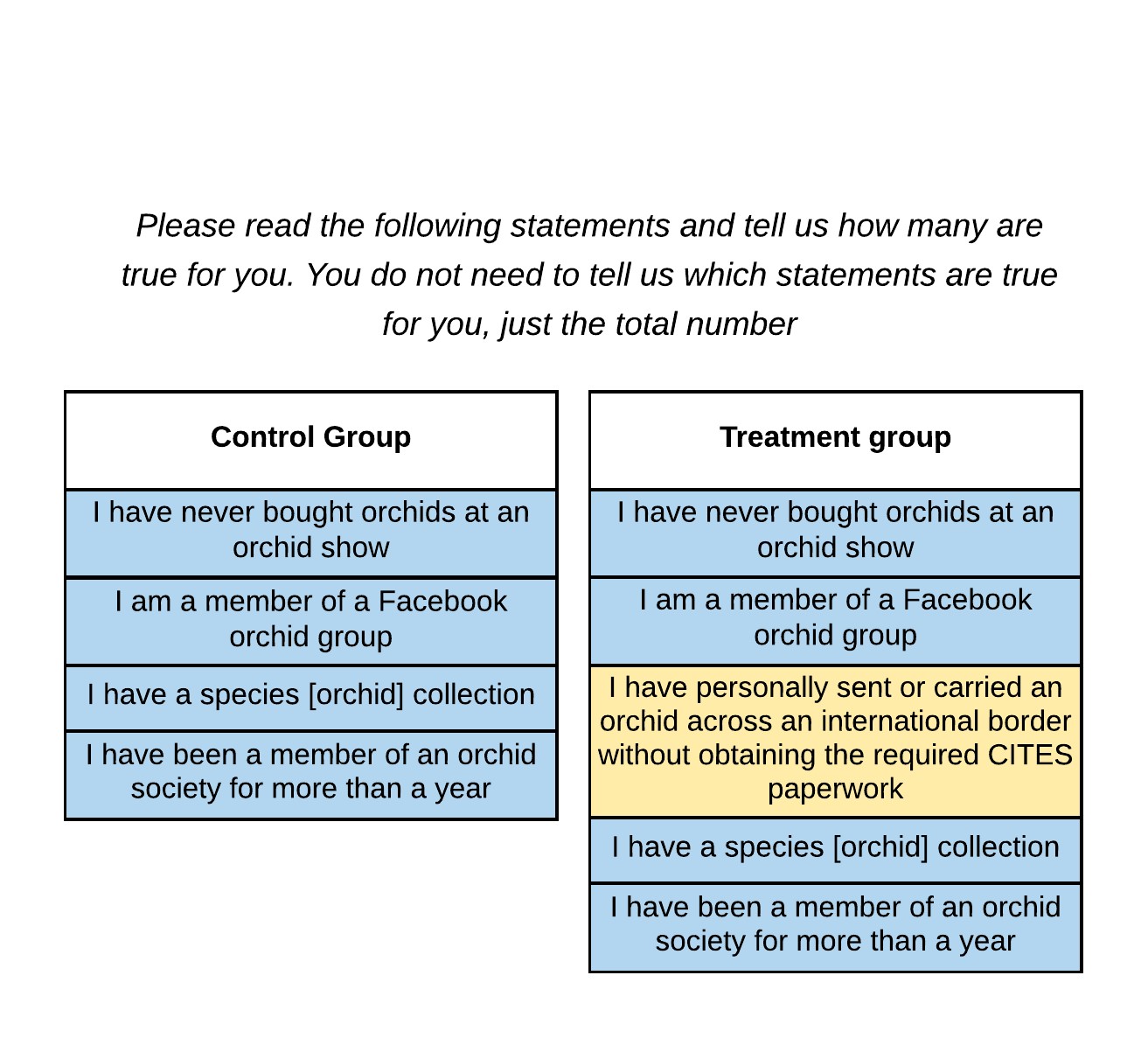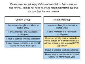 A random 50% of respondents are shown a list of only non-sensitive items (shaded blue in this example about international illegal orchid trade), whilst the other half see a list with an additional sensitive item (shaded yellow in this example).