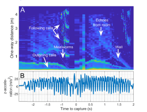 On-board tags can also now capture the primary sensory information in the form of echoes, while the bats are on the wing. To ground truth this type of data from wild bats, we have trained bats to catch tethered mealworms in a controlled setup in the laboratory while carrying a tag. In the video below, the echo stream carrying the necessary sensory information from the mealworms to the bat has been quantified and visualised. Based on only these echoic streams, bats can extract information on the size and location of the prey. They use this information to guide the pursuit and capture.