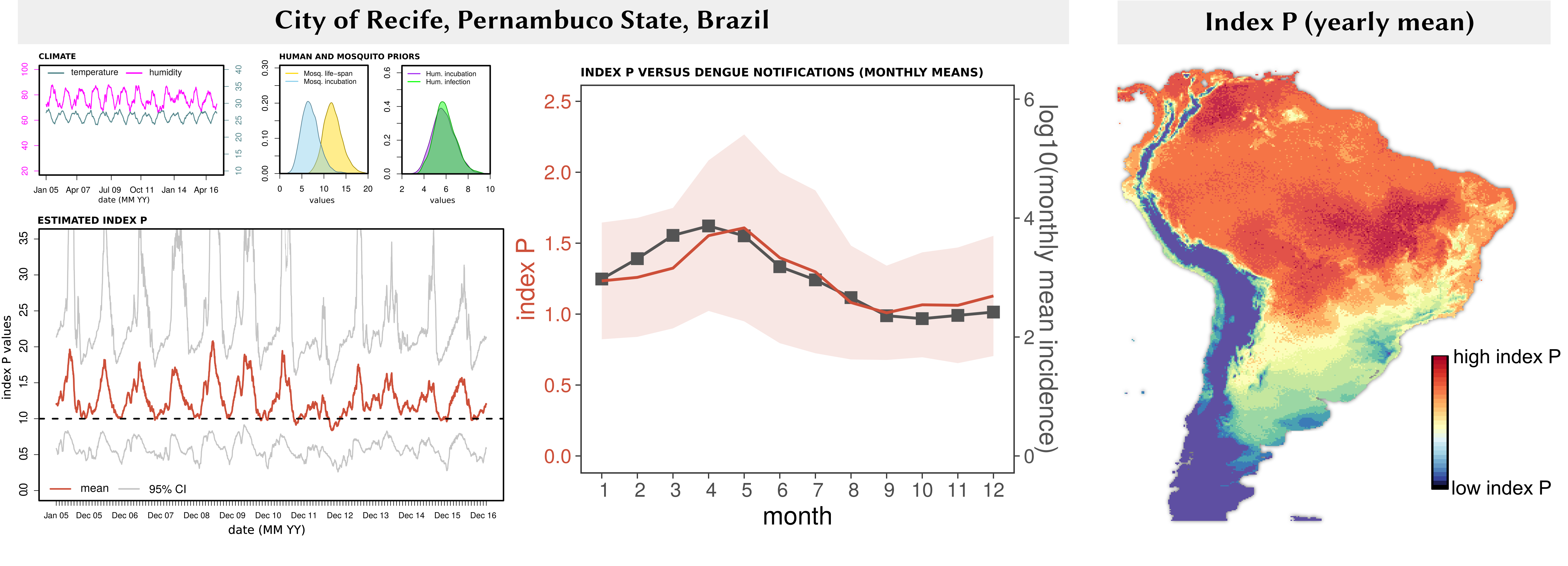 In the context of dengue, the index P can be used in many ways. For instance, having access to local, long-term time series of temperature and humidity allows you to reconstruct the climate-driven transmission potential of the virus. You can then verify how well this reconstructed transmission potential mimics the observed number of dengue infections. If a good match is reproduced (as shown in our example for Recife, in the center), we can draw some conclusions about the local epidemiology of dengue. For example, we were able to identify weather conditions that favour transmission in the city, as well as the times of the year when transmission is likely to be low or high.