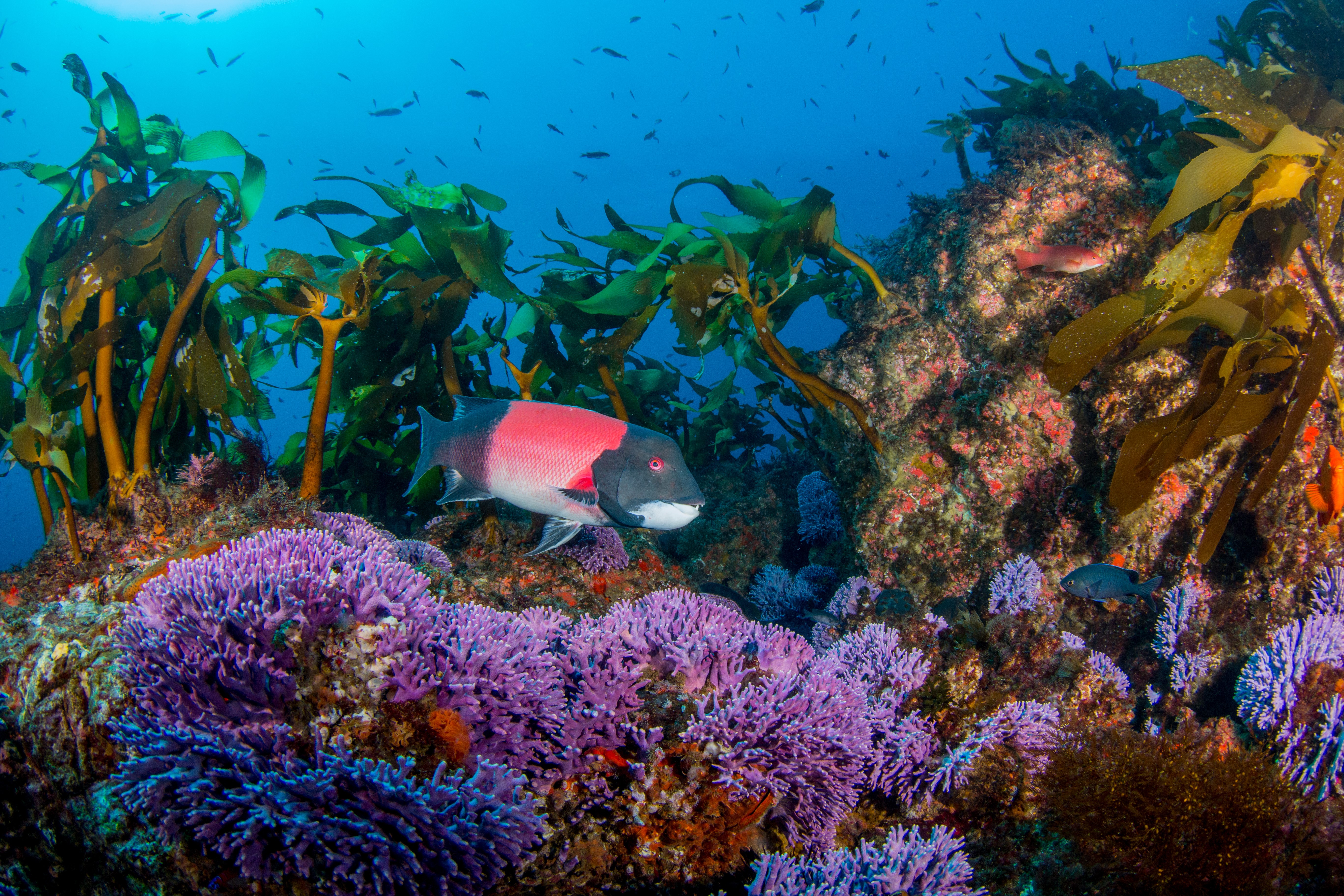 A male California sheephead swims over purple hydrocoral and southern sea palms at Farnsworth Bank, off Catalina Island. This colorful and diverse marine seascape represents a small fraction of the unique biodiversity of California that can be detected and monitored using environmental DNA (eDNA). eDNA metabarcoding is a promising method to monitor species and community diversity that is rapid, affordable and non‐invasive.
