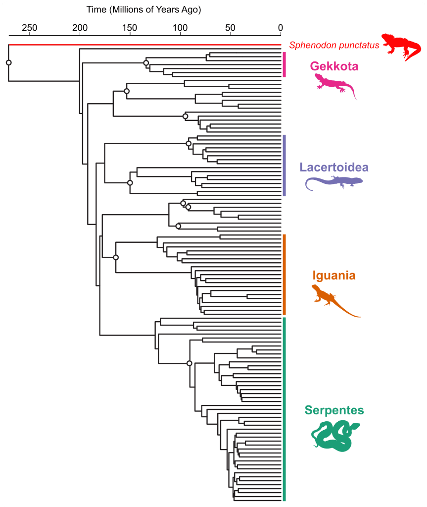 Living fossils belong to lineages that diverged a long time ago from its other ‘non-living fossils’ relatives. Due to this ancient divergence, we’d expect that their DNA would reflect this evolutionary history and that those living fossil lineages would be attached to the base of the phylogeny. That would mean those lineages are represented as originating a very long time ago, with very long branches (up to a couple hundred million years old in the case of the Tuatara, for example). But, it’s important to keep in mind a key limitation of molecular phylogenies: they don’t record direct information about lineage extinction!