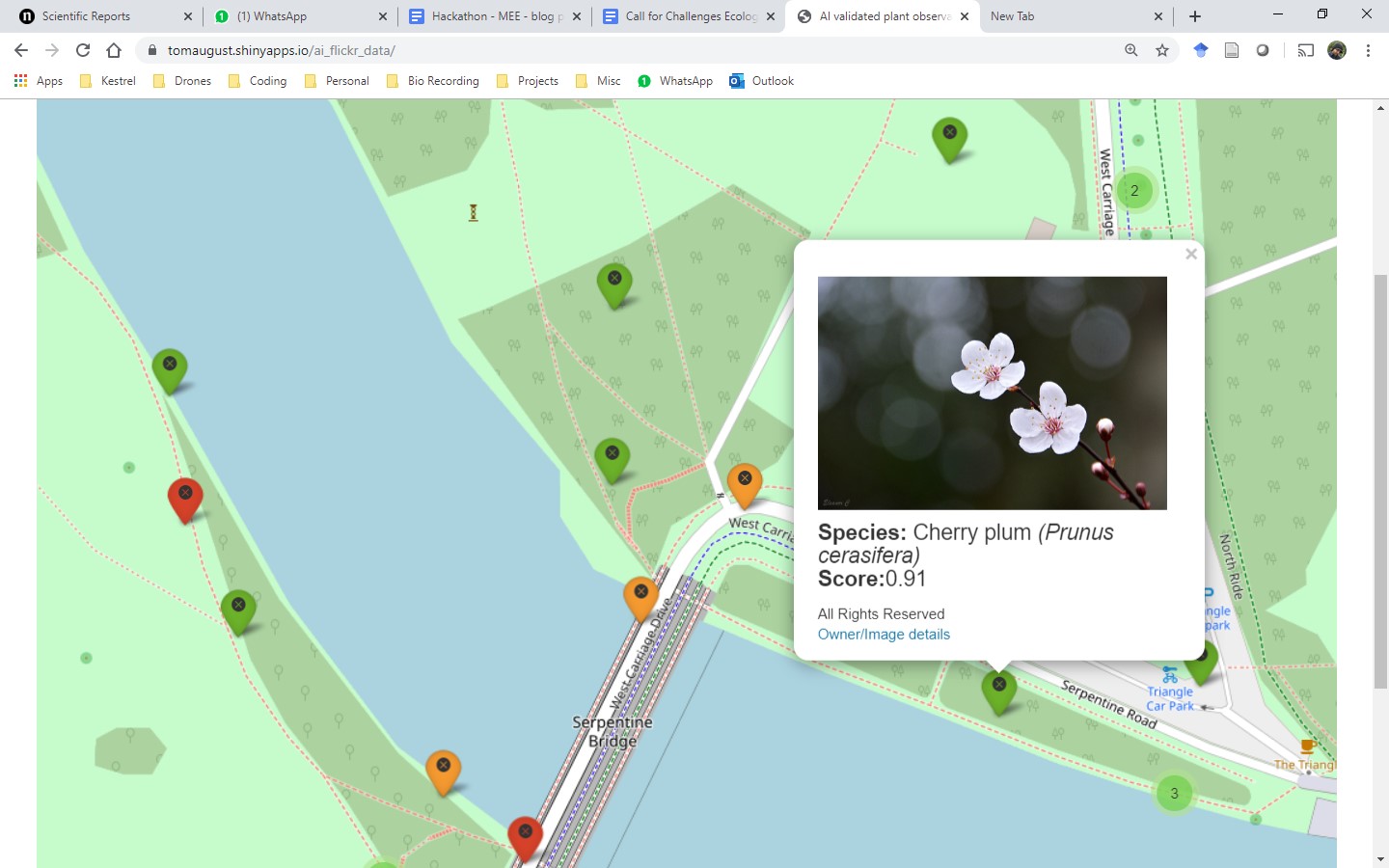 Our group combined two open-source R packages – ‘photosearcher’ and ‘plantnet’ – to build a real-time map of plant observations in London. ‘photosearcher’ retrieves photos from Flickr according to a series of search terms. plantnet interfaces with a plant image classifier, returning a species identification and an associated likelihood for a given photo. Using leaflet and RShiny, we then mapped the output of photosearcher and plantnet onto an interactive map of London. This allowed us to display the geographic location of each photo and its approximated species-level identification from PlantNet’s the image classifier. After the workshop Tom used the code we shared on GitHub to take the idea further, creating a large, AI verified, dataset of over 30,000 plant observations in London. That dataset is now available on Zenodo.