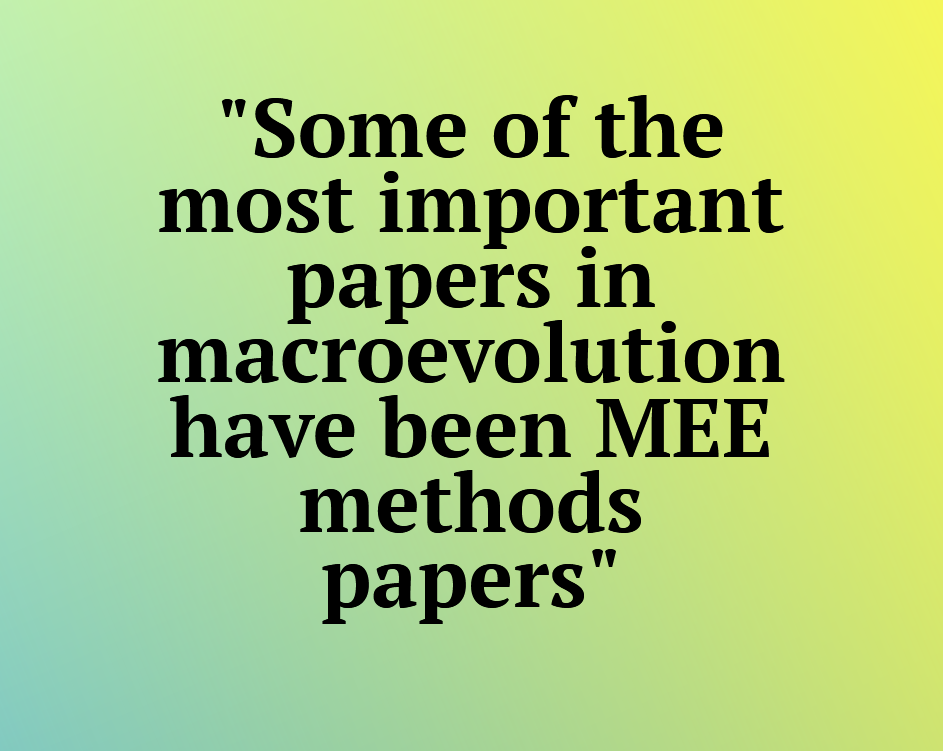 Some of the most important papers in macroevolution have been MEE methods papers. A particular citation stand-out is Revell (2012), who continues to provide the field with much-needed analysis and visualisation tools in R. Other highly-cited papers include Yu et al. (2017) on flexible plotting of trees in R, and FitzJohn (2012) on state-dependent speciation and extinction models in R. In a field with complex data types, great tools for visualisation and analysis are always in demand. R is fast becoming the best pathway to access the latest methods.