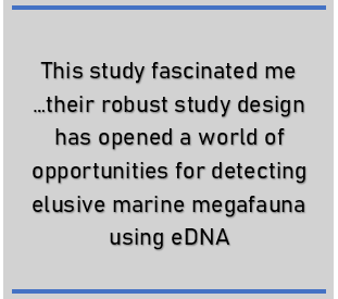 Two of the main limitations of eDNA research are the ability to detect DNA within large volumes of water, such as the ocean, and the (often) slow turnaround of sample processing. The paper by Truelove et al. (2019), overcame both of these issues through using a portable Oxford Nanopore MinIon sequencer to sequence eDNA samples for white shark (Carcharodon carcharias). This study fascinated me, regarding their ~48 hr time frame from sample collection to presenting of results and their robust study design has opened a world of opportunities for detecting elusive marine megafauna using eDNA.