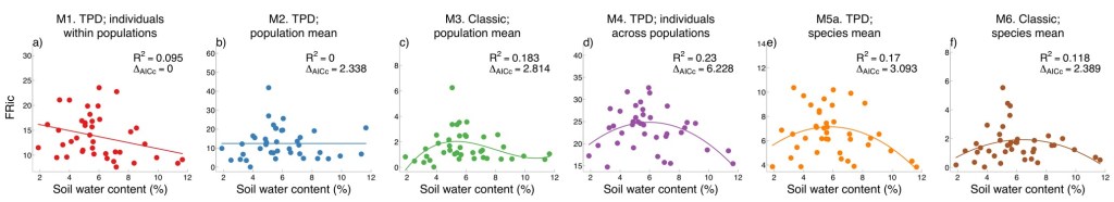 The main takeaway from our paper which I find most compelling was that a failure to account for intraspecific trait variability altogether can very drastically alter the relationships between functional diversity patterns and environmental factors. These relationships can be altered to the extent where linear relationships go non-linear, even generating false positive (Type I errors) or false negative (Type II errors) effects for the factors structuring the communities.