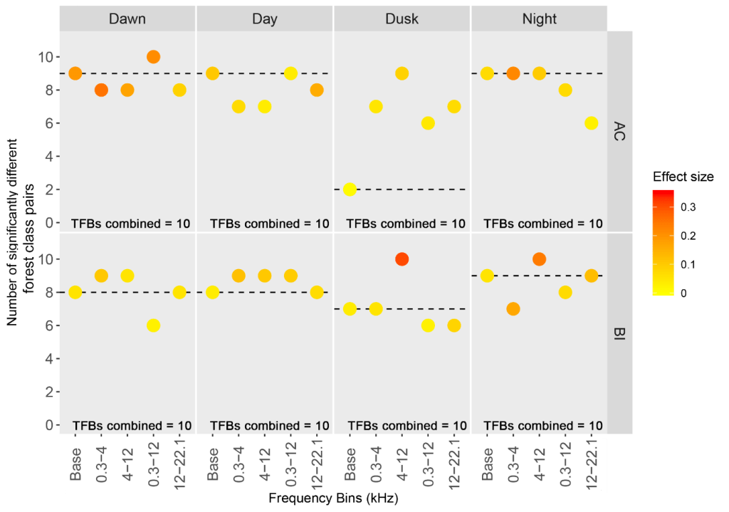 We argue that this is because using broad ranges for measuring indices don’t fully capture the complexity of taxonomic response to different habitats. For instance, cicadas that stridulate at 5-8 kHz in the middle of the day might increase in forests that let in more light, but bird species that feed on the ground and call at 0.5-2 kHz at night might decrease. Trying to characterise soundscapes in a single measure masks these responses. Instead, it’s better to use a range of (ecologically meaningful) time and frequency bins. We saw the scale of the improvement when we used our indices data as training variables in a Random Forest to predict forest class – with the broadest frequency bands accurately predicting forest class just 62.1% of the time when differentiating between all five forest classes, and the range of narrower bins being 88.2% accurate.