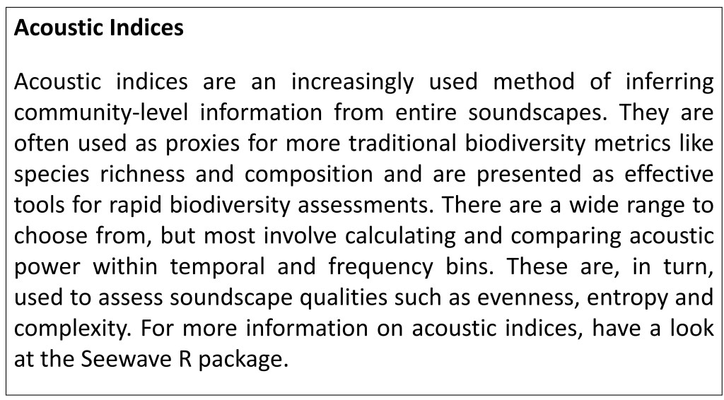 We believe that using acoustic indices at narrower time and frequency bins can greatly improve the efficacy of acoustic indices, both in characterising landscapes and as a proxy for biodiversity. To some, the requirement of a priori ecological knowledge to inform the boundaries of these bins may seem an onerous requirement. However, we believe that a relatively short amount of time reviewing acoustic recordings and the application of some ecological common sense can result in some big improvements in the functioning of acoustic indices, as was the case for us!