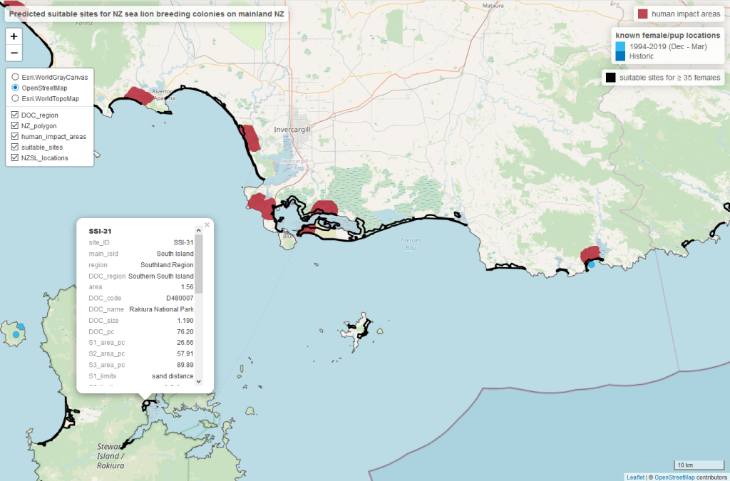 With hopes to fill this important gap in conservation application, our paper in Methods in Ecology and Evolution introduces the integrated SDM database (iSDMdb). The iSDMdb is an extended habitat suitability assessment that uses SDM results to create a spatial database of predicted sites that contains additional, user-friendly, informative data fields. These data fields synthesise and summarise SDM predictions and uncertainty, human impacts, restoration features, novel preferences in novel spaces, and management priorities. We created these data fields using a mix of methodologies in addition to traditional SDMs (e.g., multi-state SDMs, multivariate environmental similarity surfaces, multi-criteria decision analysis). We included these within the iSDMdb based on our engagements with wildlife rangers, managers, and decision-makers regarding conservation efforts for our case study species, the New Zealand sea lion (Phocarctos hookeri).