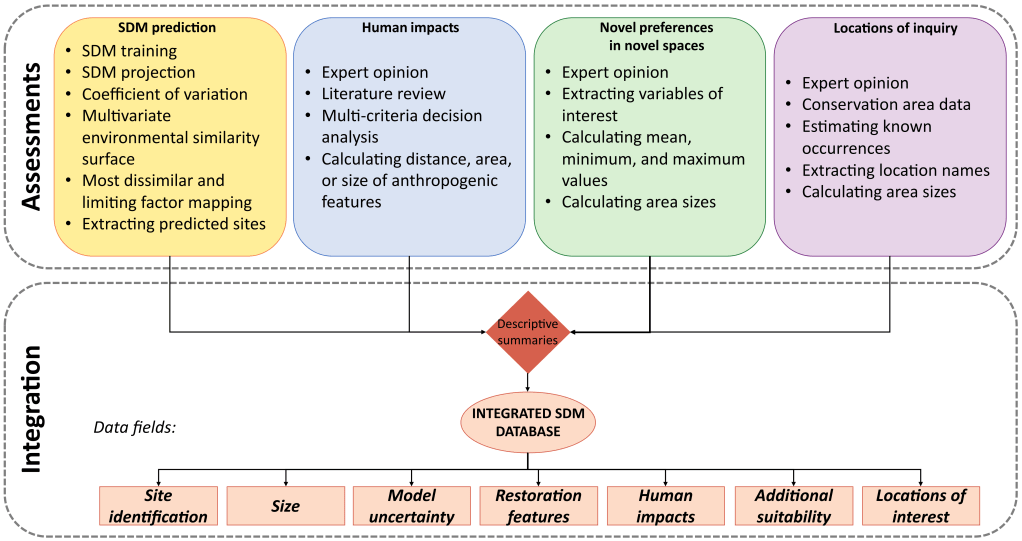The iSDMdb is a flexible tool and can be created using any SDM algorithm or other habitat suitability assessment method, and additional supplemental assessment types can be integrated or excluded as needed. We provide reusable R code to create an iSDMdb for your own species in Appendix S1-S8 of the article, GitHub, the Dryad Repository, and Zenodo.