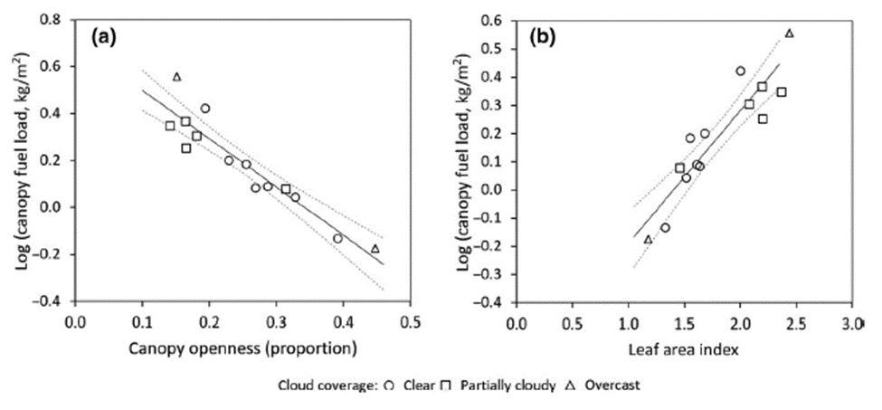 The novel method of Cameron et al. gets around many of these difficulties. They attach a fisheye lens to a smartphone and process the hemispherical images taken using recently published free software (the R package caiman; (Díaz 2021)) . Their method can be easily deployed by forest managers or fire crews, as it does not require specialised training or protocols: there is no need for meticulous levelling techniques, and different photographers can be used across sites. Their resulting estimates of canopy openness explain over 80% of the variation in canopy fuel load measured with traditional methods.