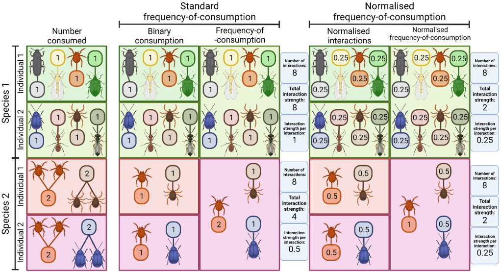 For example, in the image above the two species are eating the same number of individuals. Species 1 is a generalist with the two individuals each eating four different prey species. Species 2 is a specialist with the two individuals eating only two prey species each, one of which overlaps, but they still eat four prey individuals each. If these are added up from binary data and frequency-of-occurrence calculated, species 1 has a total interaction strength (the number of interactions included in the network) of 8, whereas species 2 has a total interaction strength of 4, despite both species having the same number of interactions. By first normalising these values through including each eaten species as a fraction of one for each individual predator, the total interaction strength is equal between the two species.
