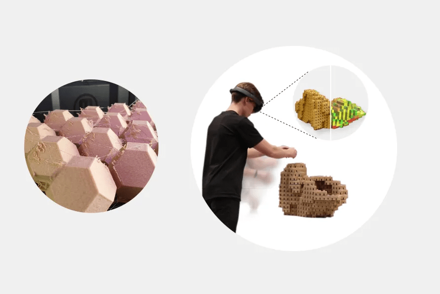 We built two types of computationally designed hollows – one made from 3D-printed wood and the other from hempcrete (a building product that is a mix of hemp wood fibres with lime and water). Our assembly process uses augmented-reality headsets that overlay digital guides atop physical models to simplify the assembly using modular components.