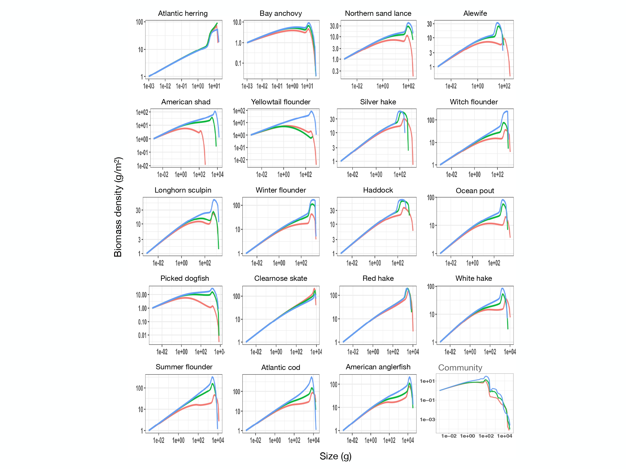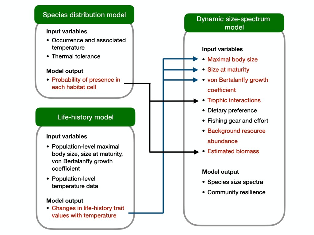 Our framework stands on the shoulders of several well-established methods, including the species distribution models , global-scale life-history analyses , and the size-based food-web model with the R package mizer. Integrating these methods into the same analysis, our framework allows us to examine how size distribution of individuals would change within species under warming and how resistant the community would be as a whole to large-scale disturbances.