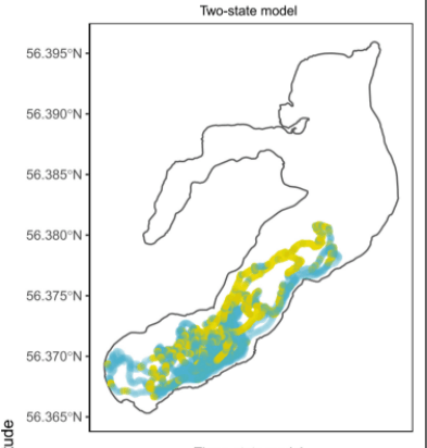 Predicting aquatic animal movements and behavioural states Fine-scale tracking with passive acoustic telemetry can yield great insights into the movement ecology of aquatic animals. To predict fine-scale positions of tagged animals in continuous space from spatially-discrete detection data, state-space modelling through the R package YAPS provides a promising alternative to frequently used positioning algorithms. However, YAPS cannot currently classify multiple kinds of movement that may be used as proxies for individual behaviours of study animals (behavioural states), an endeavour that is of increasing interest to movement ecologists. Here, Whoriskey et al. advance YAPS by incorporating the functionality to predict behavioural states by using an iterative maximization framework.