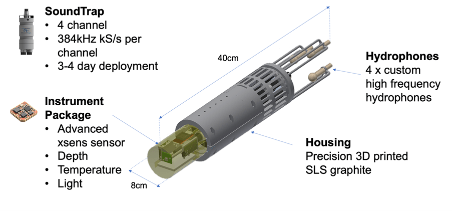 We based our system the 4-channel SoundTrap from Ocean Instruments. This state-of the-art device is one of the most advanced multi-channel autonomous underwater recorders available, but more importantly, it’s open-source! That meant we could get right into the firmware of the device, which we needed to do to allow us to record orientation data. The SoundTrap actually has it’s own basic orientation sensor but we required something more accurate to allow us to calculate precise geo-referenced bearings. After some searching, we settled on the xsens MTi-3. Not only is this sensor tiny (the size of a thumbnail) but it does a bunch of sensor fusion calculations on board which compensate for many of the usual pitfalls of high precision orientation sensors. With open-source firmware of the SoundTrap and some electronic board fabrication based on Arduino tech, we were able to integrate the xsens sensor into a SoundTrap, allowing us to accurately time synchronise the orientation data from the xsens and the acoustic data from the SoundTrap.