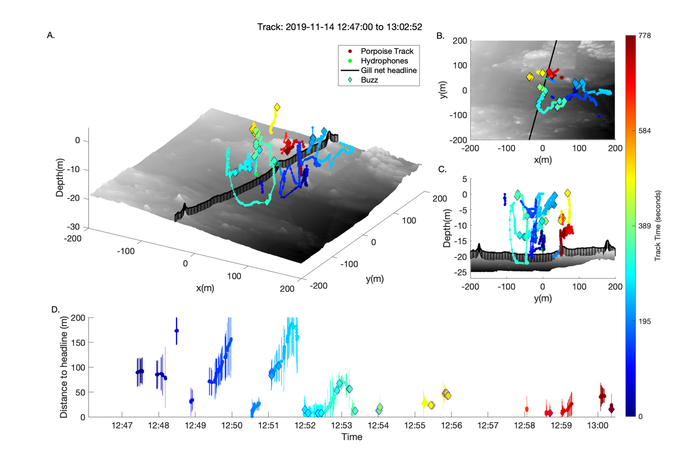 7 days of data from similar locations isn’t exactly the largest dataset in the world, but, even these initial results showed us some interesting behaviour. We saw examples of porpoises avoiding the nets, as we might expect, but also spending significant periods of time around the net (below). Those that were near the net were making click patterns that indicated they were foraging, suggesting that, perhaps, prey aggregating around the gill nets attracts porpoises. We need way more data to make any concrete conclusions on the broadscale behavioural influences of gill nets on porpoises, but this project showed a proof of concept. That is, we can now, relatively inexpensively, collect fine-scale behavioural data around gill nets, opening a whole host of possibilities to try and unlock the deadly mechanism(s) behind bycatch.