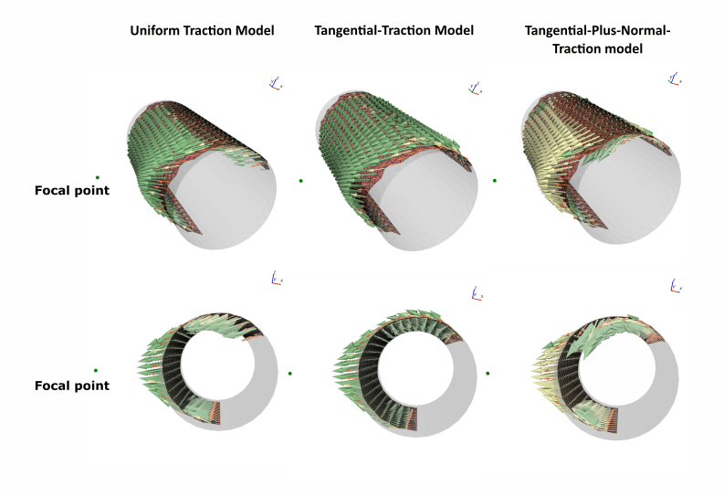 We updated this routine and created an open-source linear static solver, implementing three different ‘traction scenarios’ which distribute forces across a muscle insertion area. The first scenario is called a Uniform Traction. In this scenario, force vectors pass straight through the surface of the bone. This is not entirely realistic, but does reduce computation time for the model. The second scenario is a Tangential Traction, which simulates the wrapping of muscle fibres around the bone without any force vectors passing through the bone – this is much more life-realistic than the Uniform scenario. The last scenario is a Tangential-Plus-Normal Traction scenario. This model not only simulates the forces within the muscle fibres wrapping around the bone, but also incorporates the contact forces between muscle and bone (the normal force) which is also pulling on the bone. The Tangential-Plus-Normal model thus represents the most life-realistic muscle-muscle modelling simulation available.