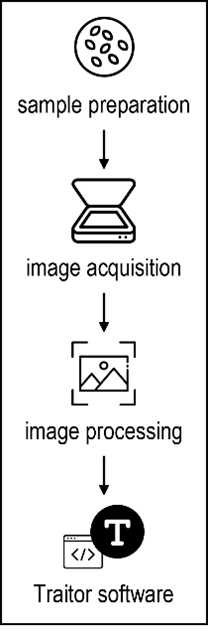 To address these challenges, we have developed a method which consists of a simple image acquisition and processing protocol coupled with an open-source software called Traitor. The workflow for trait extraction involves scanning seeds against a high-contrast background with a flatbed scanner, correcting image colours, followed by a fully automated image analysis with the software.