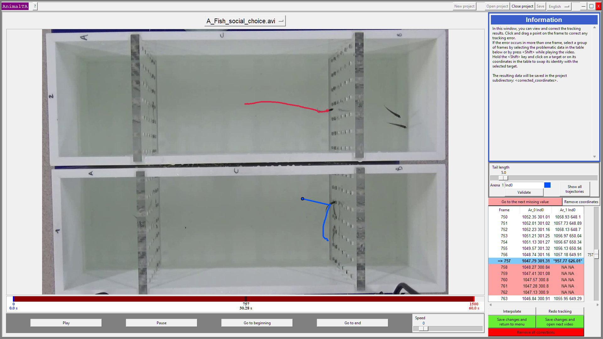 Once you identified portions of videos with tracking errors, you have various options to correct them. You can correct by hand the position of the targets by clicking directly on the video. You can also interpolate the trajectory between two frames, in case of straight-line movements, or select the problematic portion of the video and re-run a tracking with different parameters for this portion. This last option is, to our knowledge, a novelty in video-tracking programs, which will highly facilitate the work of our users.