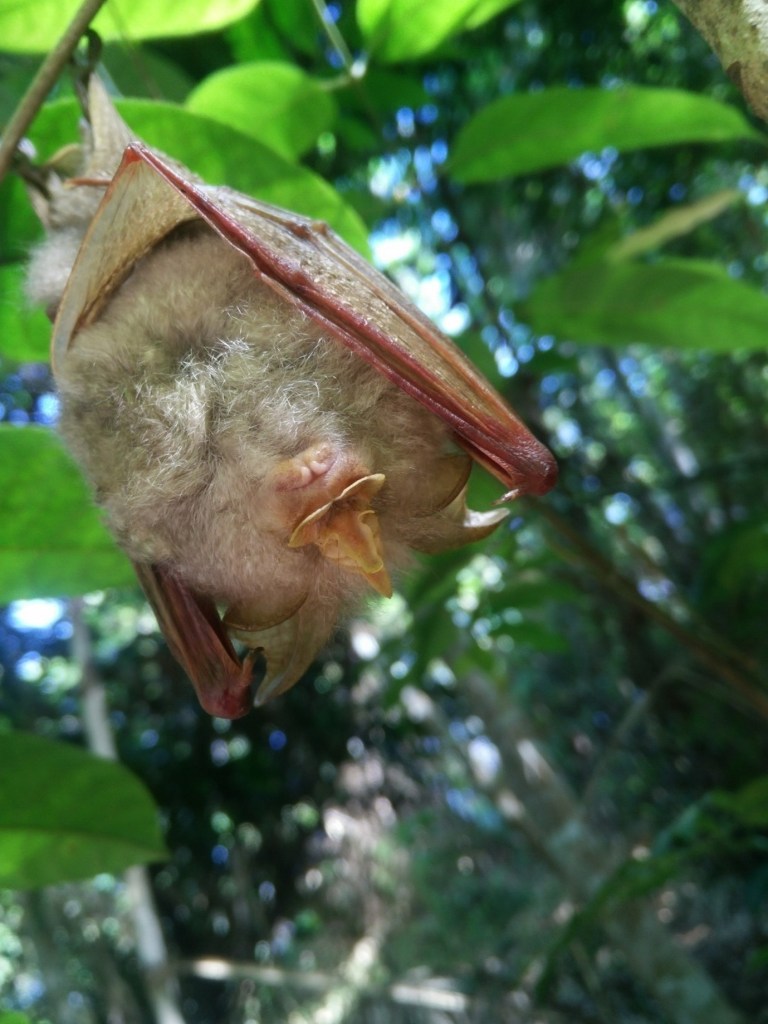 Picture 3- Photo of a Trefoil horseshoe bat (Rhinolophus trifoliatus), a locally common forest bat found across Borneo. R. trifoliatus is listed as Near Threatened by the IUCN as populations are declining due to forest loss. We found that R. trifoliatus was abundant across logged forests but did not persist in tree plantations demonstrating the potential for logging concessions to support the conservation of this species (Photo credit Dr Natalie Yoh).