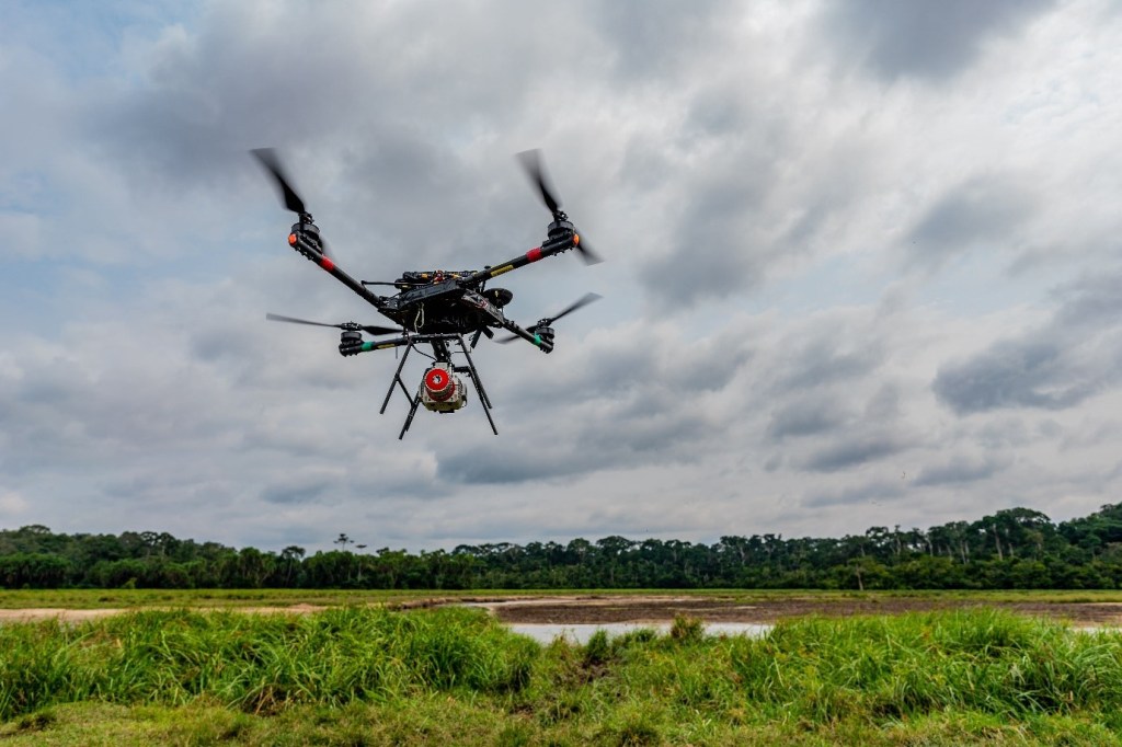 Picture 1- The Harvard Animal Landscape Observatory—a high-resolution, UAV-borne Light Detection and Ranging (LiDAR) platform—taking off in Odzala-Kokoua National Park, Republic of Congo. Active remote sensing technologies, including LiDAR and Radio Detection and Ranging (RADAR), are critical for quantifying vegetation structure in ecological, restoration, and management studies. Photo credit: Evan Hockridge