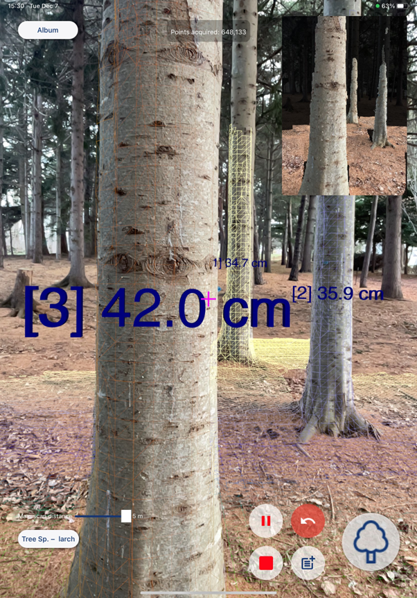 Picture 1- A screenshot of ‘ForestScanner,’ a free mobile application for measuring and mapping trees with LiDAR-equipped iPhone and iPad. As users scan trees with an iPhone or iPad, ForestScanner estimates stem diameters and spatial coordinates in real-time. The stem diameters will appear on the screen in an augmented-reality manner, as shown in the picture. We expect the application to facilitate cost-, labor-, and time-efficient forest inventories, as well as increase the accessibility to LiDAR for non-experts including students and citizen scientists. Photo credit: Shinichi Tatsumi.
