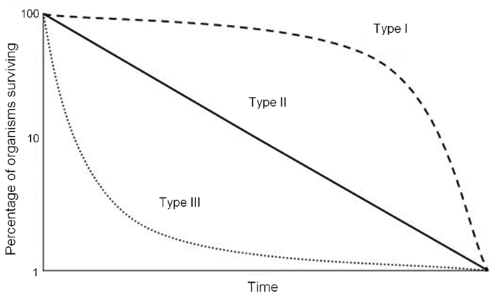 The three types of survivorship curves that Keyfitz’ entropy can distinguish: type I, an increasing mortality rate with age (senescent), type II, a constant mortality with age, and type III, a decreasing mortality rate with age (negatively senescent).