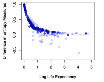 We found that, as a consequence, nearly 40% of survivorship curves were getting erroneously classified (for example, as senescent when they were in fact non-senescent). In addition, we show that the error induced by the old metric correlates strongly with life expectancy (in Figure 2b of our paper). Any correlations obtained between Keyfitz’ entropy and measures of the so-called pace of life, such as life expectancy, in these previous therefore need to be reevaluated, and conclusions drawn from these comparative demographic analyses need to be carefully reconsidered.