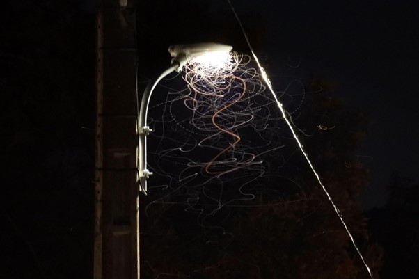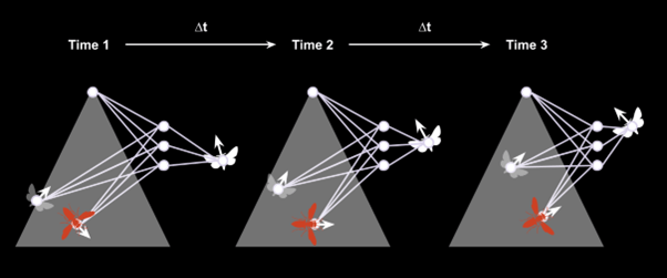 One warm summer night in the south of France, I was watching moths flying around a street light, and spotted a hornet chasing after its next meal. I captured the scene with my camera and was struck by the intricate tangle of untouching light threads tracing the moths’ and hornet’s flight paths. How were the moths able to avoid colliding with each other while evading the hornet? Were their flight patterns random, or did they follow a simple set of rules?