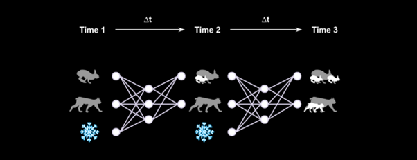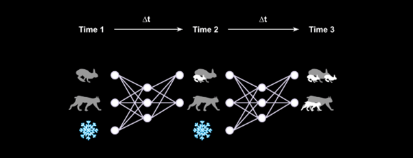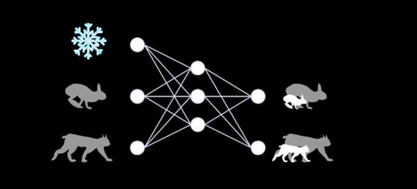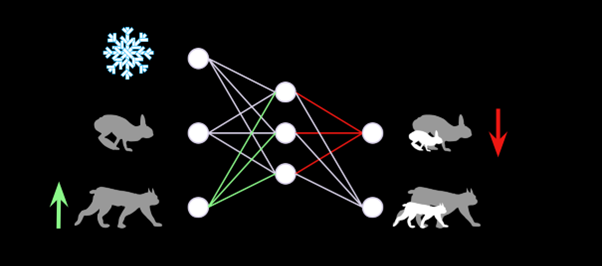 Neural networks can learn from data collected in the field how the current state of an ecosystem, for example the number of hares, lynx, and the weather conditions, influences the growth of both populations.