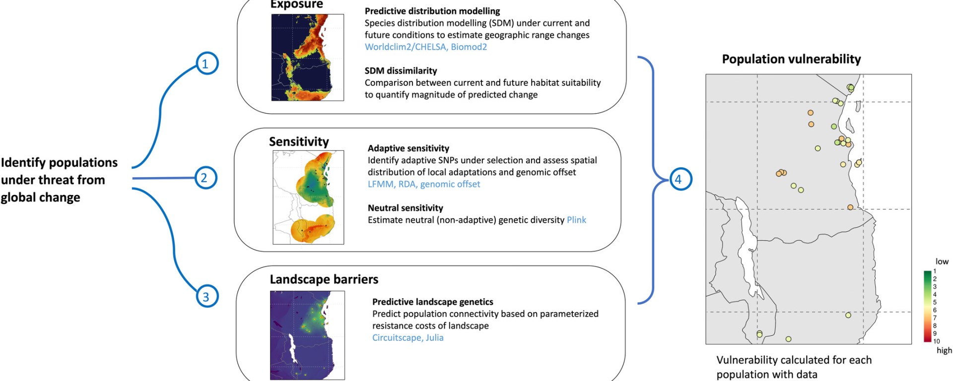 Life on the edge is a toolbox of interconnected R, bash and Julia functions and scripts which can be used to perform a number of tasks to evaluate how different populations within species might be affected by future global change. It runs from a parameter text file, where you can control up to almost 70 different parameters suitable for your study species (you can analyse many species with a set of parameters on a different line for each). With it, you can evaluate the spatial, environmental and evolutionary aspects of predicted changes between current and future environmental conditions using complementary data types, in line with the terms adopted by the Intergovernmental Panel on Climate Change (IPCC) in 2007. For example, you can evaluate how changing environmental conditions and habitat suitability (using Species Distribution Models) may affect populations (‘Exposure’), and you can model how future changes to the landscape and environmental conditions may impede gene flow between those populations (‘Landscape barriers’). At the molecular level, you can quantify neutral genetic diversity (‘Neutral sensitivity’) across populations as well as assessing local adaptations to their environment and how these genotype-environment associations may be affected by future environmental changes (‘Adaptive sensitivity’) in populations. LotE quantifies all of these metrics in a consistent way, and you can use them all together to create an index of ‘Population vulnerability’ and map this across your study region (see Fig. 1). Alternatively, you can use the individual metrics themselves to provide information on which conservation actions may be necessary for specific populations. For example, an isolated population with low gene flow to others and high climatic exposure might benefit from assisted migration. A population with higher gene flow to others and high adaptive sensitivity, on the other hand, might be suitable for protected area implementation or habitat restoration along connectivity corridors.