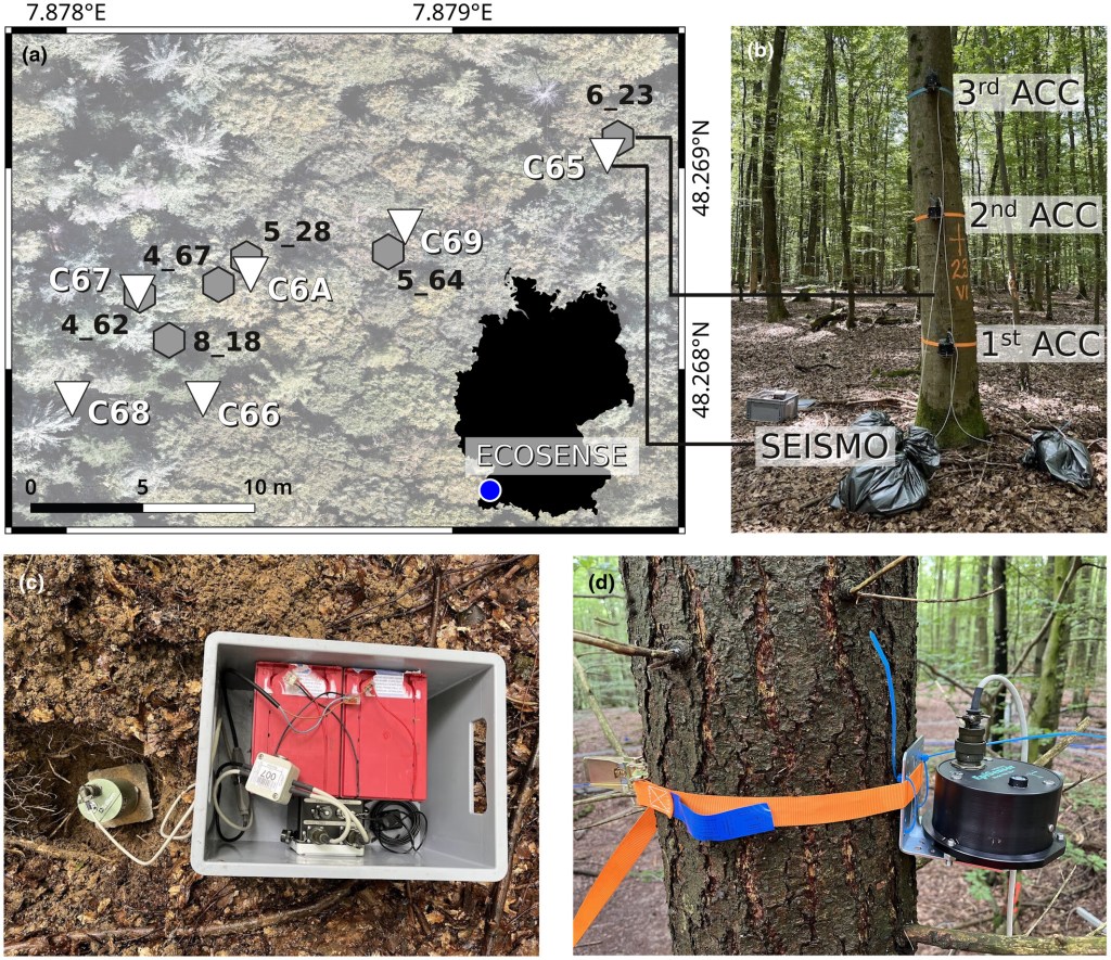 Here, authors propose a novel alternative approach to monitor tree stress tracking tree sway through its seismic ground motion signature, referred to as the tree’s seismic fingerprint. These wind-induced sway signals are intrinsically linked to the mechanical properties of leaves, branches and trunks, which change under environmental stress. Seismometers offer key advantages: they are non-invasive, low-maintenance and easily scalable for tree monitoring across forest plots. The authors findings show that seismometers can passively monitor both environmental forcing and tree biomechanical response. As such, seismic sensing offers a powerful, scalable tool for forest monitoring, with the potential to capture both structural stability and stress-related changes under climate extremes.