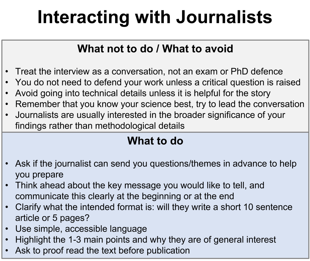 If you are contacted by a journalist, it helps to think in advance about the key message or story you would like to convey and to communicate this clearly. Try to approach the interview as a conversation rather than an interrogation. You are the expert on your research, and know your science better than anyone, while the journalist brings expertise in storytelling and audience engagement. It can be useful to ask for the interview questions ahead of time to help you prepare, and to gently guide the discussion toward what you feel is the most important story your research can tell.